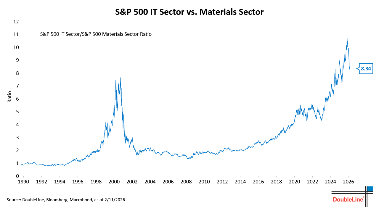 Relative prices reveal market extremes more clearly than absolute prices. One of the most extreme ratios today is that of the S&P 500 Index IT sector to the materials sector, now near levels seen only at rare moments over the past several decades. The ratio reflects a decadelong shift in capital toward asset-light growth and away from capital-intensive physical production.