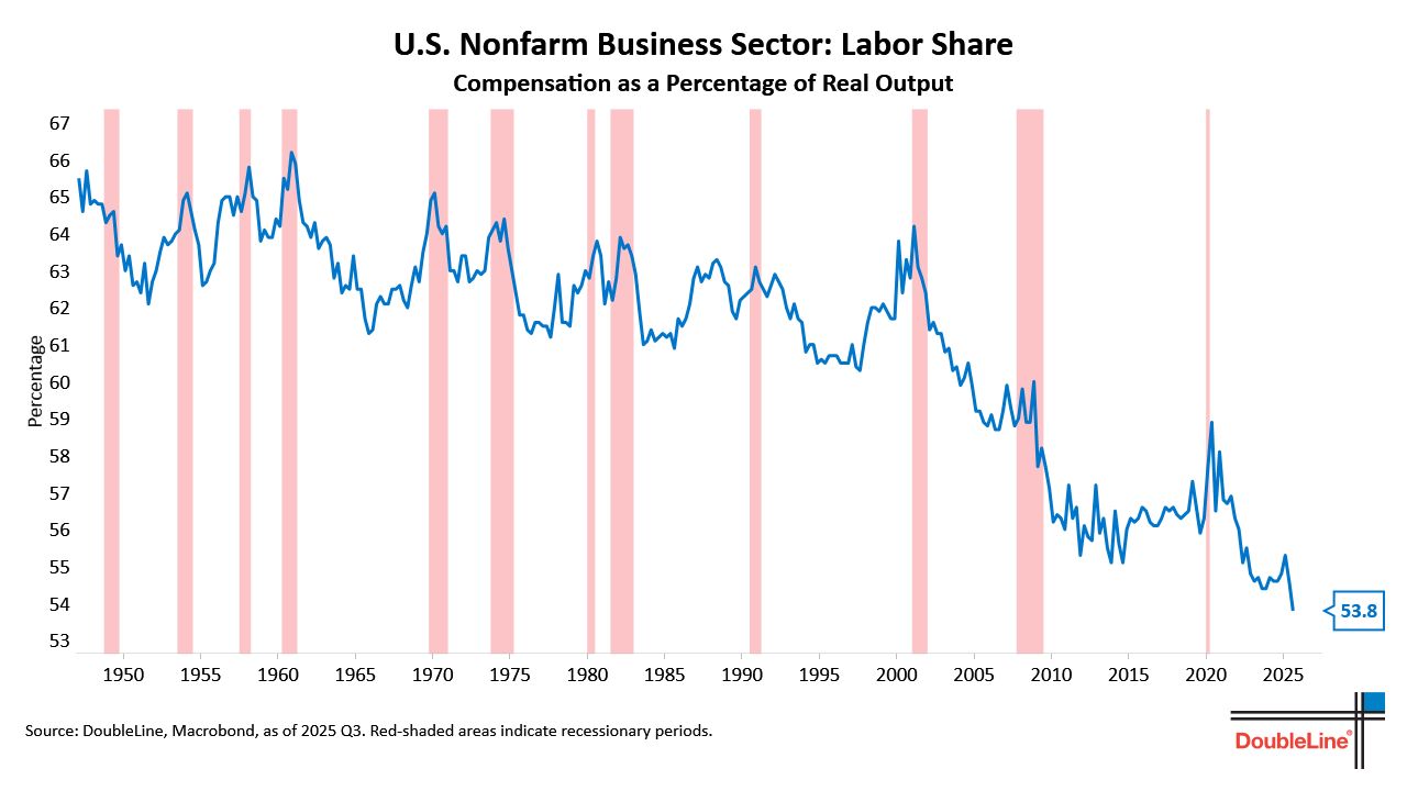 Labor’s share of output in the U.S. nonfarm business sector stood at 66.2% in 1960 and remained near 63–64% in 2000. Today it sits at 53.8%, the lowest reading in the series dating back to 1947. The decline spans multiple cycles, monetary regimes, and technological waves. The pandemic briefly interrupted the trajectory, but the series has returned to a level roughly 10 percentage points below where it stood at the turn of the century.
