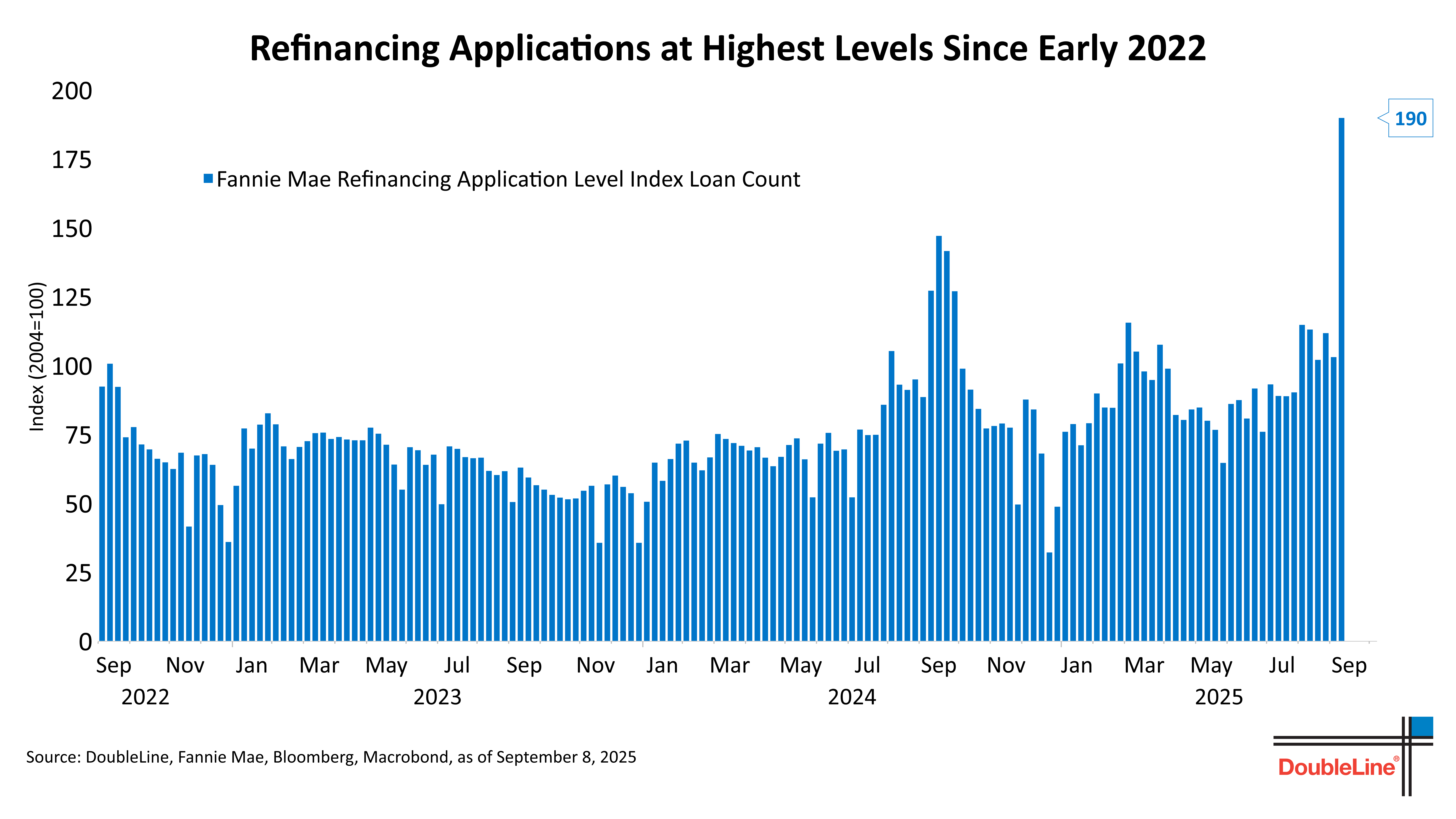 The Federal Reserve’s rate cut last week, its first since December, was hardly a surprise – markets had been anticipating it for months. The federal funds rate has moved down from its 2023 peak of 5.50% to 4.25%, and futures are pricing another 125 basis points of easing over the next year, with more likely into 2026. The bigger story is how long-term rates and mortgage spreads have moved, with the 30-year mortgage rate dropping enough to spark a surge in refinancing activity. Expectations of more Fed easing are part of the backdrop but not the only factor driving borrowing costs lower.