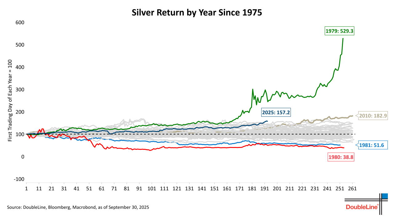 Where does 2025 fit into that history? While it lacks the speculative excess of 1979, 2025 already ranks as the second-best year for silver in five decades—well above the usual cluster of ordinary years.