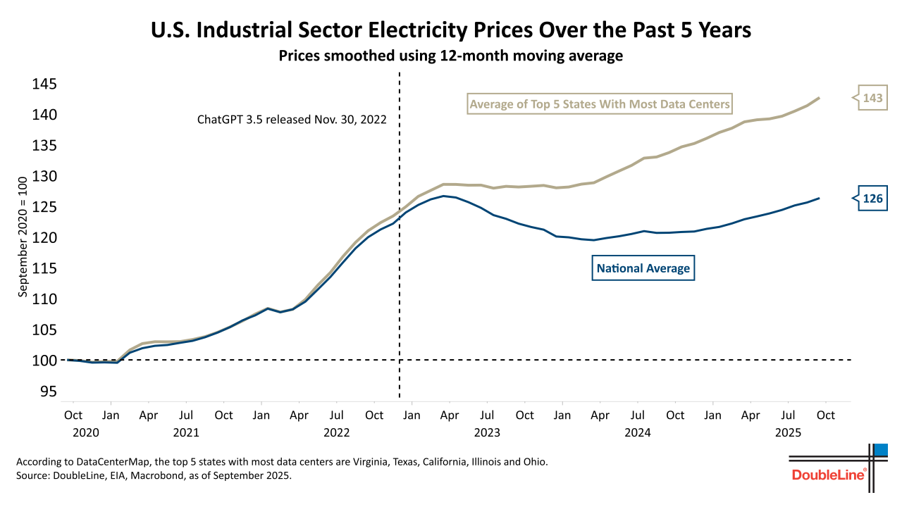 While the corporate-led AI investment boom is driving higher electricity prices, households are beginning to feel the strain. Across those same five states, household electricity prices have risen nearly 7% annually since 2022, compared with 5.5% nationally, while the electricity component of the Consumer Price Index has climbed 36% since 2020, compared with a 25% rise in overall inflation. What starts in the industrial sector eventually reaches homes and small businesses as utilities recover rising costs. Rising electricity costs risk deepening the strain on households already burdened by pandemic-era inflation and, before long, could show up at the ballot box as the effects of massive corporate investment begin to shape local politics.