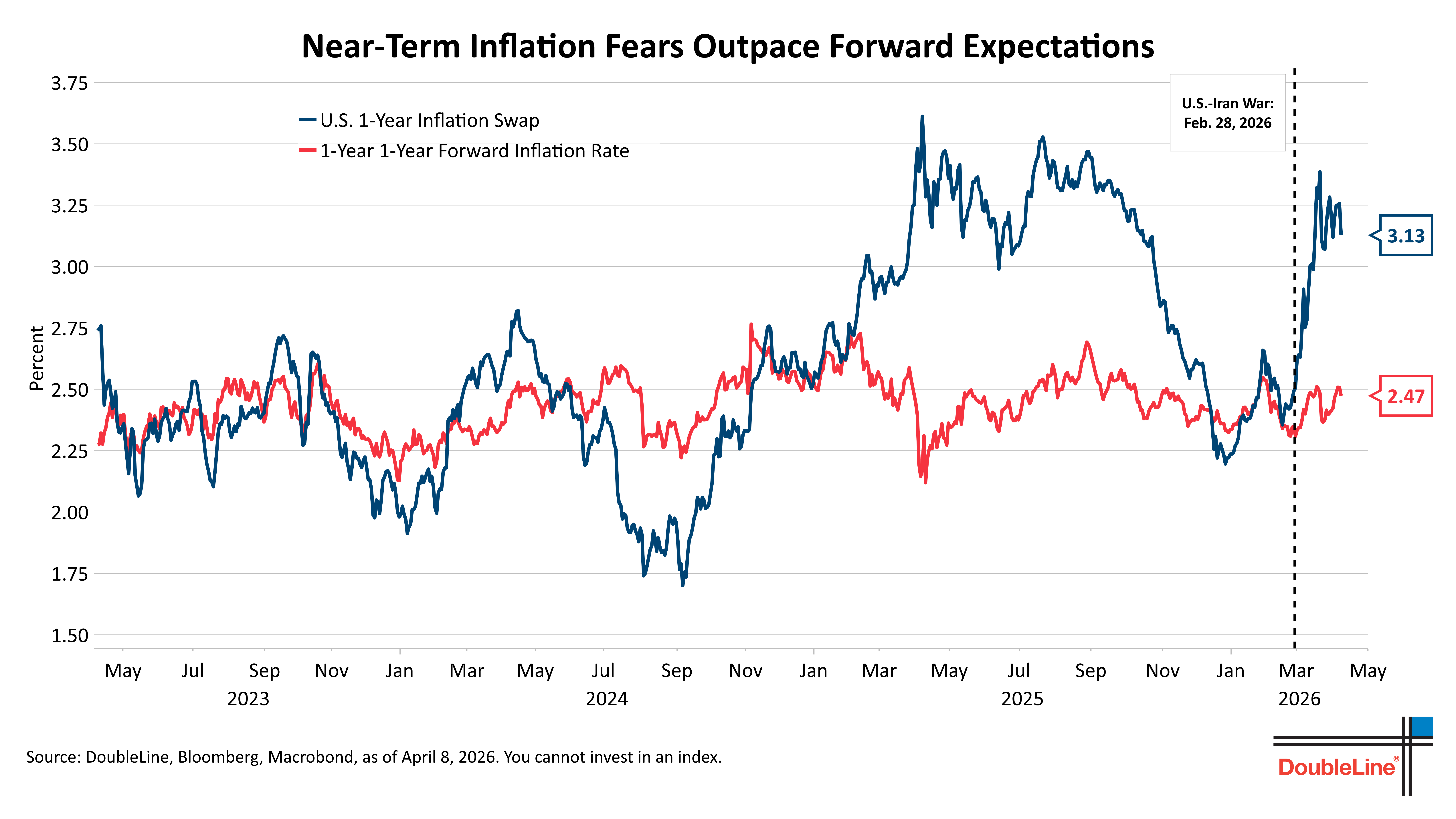 The Iran war and shipping disruption through the Strait of Hormuz pushed energy markets sharply higher and revived near-term inflation concerns. Oil, gasoline, freight, and insurance costs all feed directly into the next few quarters, and the one-year inflation swap moved accordingly. The 1y1y forward rate has remained much more contained. Since the February 27 close, the 1-year inflation swap has risen 62 basis points, while the 1y1y inflation forward rate has risen only 18 basis points.